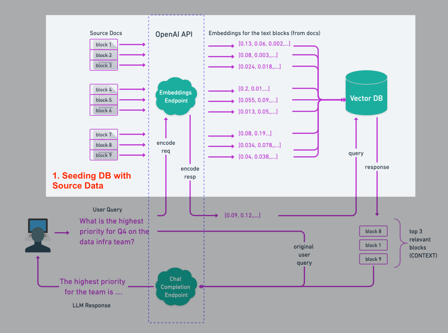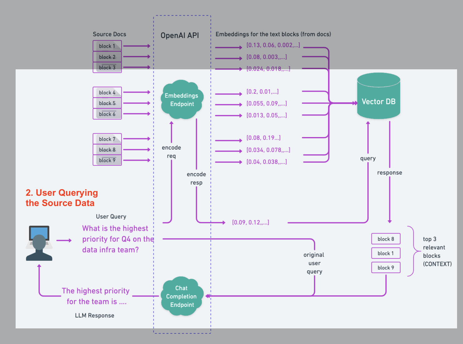 This second diagram illustrates how you’d query the vector DB and provide this as context to the LLM model: